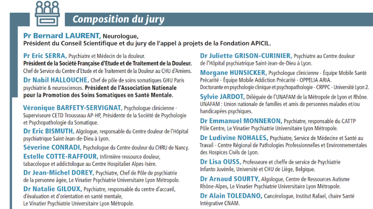 « Cette année le Conseil Scientifique et le jury ont choisi de mettre en lumière les liens entre les douleurs et la santé psychique, un sujet validé par le Conseil d’Administration* de la Fondation APICIL. A travers, cet appel à projets, la Fondation souhaite encourager les chercheurs, professionnels de santé, associations ou les établissements publics à développer des projets innovants sur le sujet de la santé psychique. L’appel à projets est ouvert jusqu’au 31 mars 2026, offrant un temps long aux porteurs de projets pour concevoir et structurer leurs propositions. Tous les porteurs de projets recevront une réponse. Fidèle à sa mission, La Fondation APICIL affirme sa volonté de rester à l’écoute des besoins du terrain, en conservant une approche ouverte et engagée sur les enjeux liés à la douleur et à la santé mentale. » Nathalie Aulnette, Directrice de la Fondation APICIL